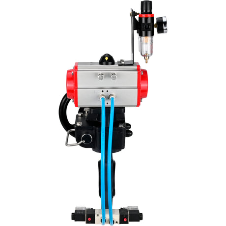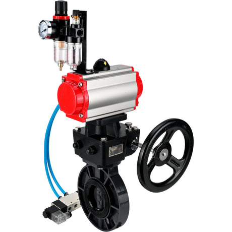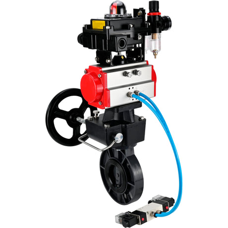 Butterfly valves Elephant WBV4242E-2W-Fb-ISO, body material - UPVC, disc material - UPVC, seal - EPDM, with pneumatic actuator double action PA-DA, pneumatic distributor 4V320-08 220V, LSU APL-410N EX and handwheel MON