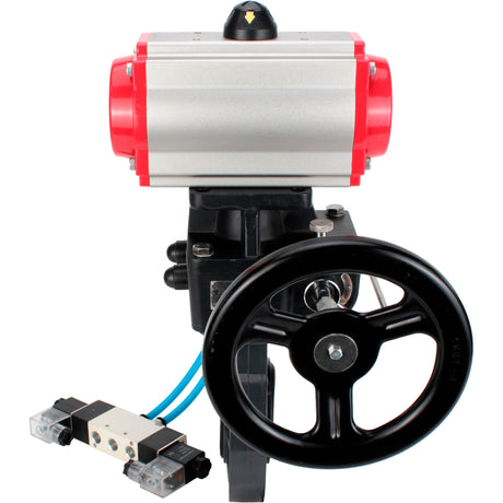 Butterfly valves Elephant WBV4242E-2W-Fb-ISO, body material - UPVC, disc material - UPVC, seal - EPDM, with pneumatic actuator double action PA-DA, pneumatic distributor 4V320-10 220V and handwheel MON