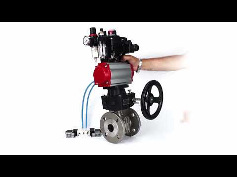 Ball valves Elephant BV3232P(2pc)-FP-F-ISO-H, body material - Stainless steel AISI 316, seal - PTFE / PTFE / Teflon, with pneumatic actuator double action PA-DA, 4V320-10 220V, LSU APL-410N Ex, handwheel MON, ATU AFC2000