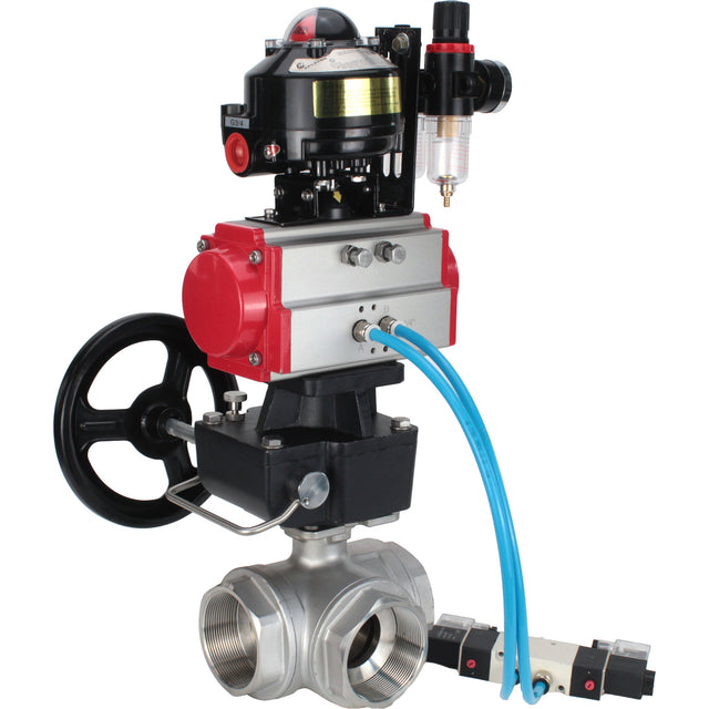 Vannes à boisseau sphérique Elephant BV3232P-SP-3L-T 3 voies type L, filetées, corps - acier inoxydable SS316, joint - PTFE, avec entraînement pneumatique PA-DA-052-083 distributeur pneumatique 4V320-08 réducteur MON BPV AFC2000 BKV APL-510N-EX