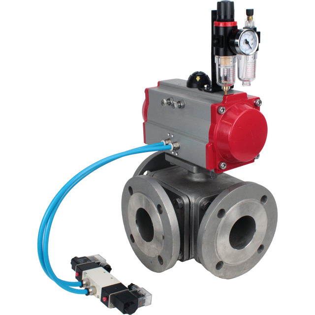Ball valves Elephant BV3232P(4pc)-FP-3WL-F-ISO-H 16 bar full bore, flanged, body - stainless steel SS316, ISO flange F03/F04-F10/F12, square 9x9-19x19, with pneumatic drive PA-SA, pneumatic valve 4V320-10 220V and ATU AFC2000