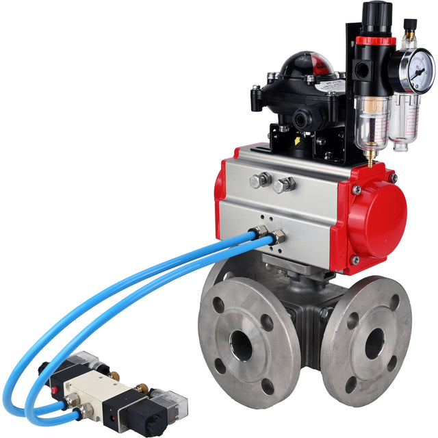 Ball valves Elephant BV3232P(4pc)-FP-3WL-F-ISO-H 16 bar full bore, flanged, body - stainless steel SS316, ISO flange F03/F04-F10/F12, square 9x9-19x19, with pneumatic drive PA-SA, pneumatic valve 4V320-8 220V, LSU APL-210N and ATU AFC200