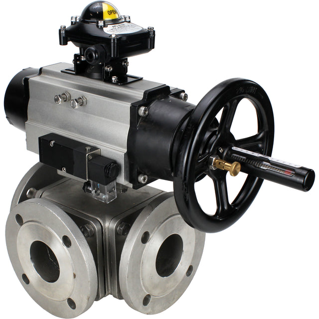 Ball valves Elephant BV3232P(4pc)-FP-3WL-F-ISO-H DN100 16 bar full bore, flanged, body - stainless steel SS316, ISO flange F10/F12, square 19x19, with double pneumatic actuator PA-DA-105-1 action, pneumatic distributor 4M310-08 220V and LSU APL-210N