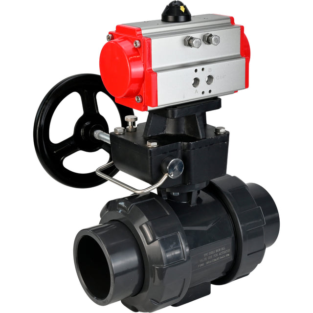 Ball valves Elephant BV4242E-FP-GRM-ISO, body material - UPVC, ball material - UPVC, seal - EPDM, with pneumatic actuator double action PA-DA and handwheel MON
