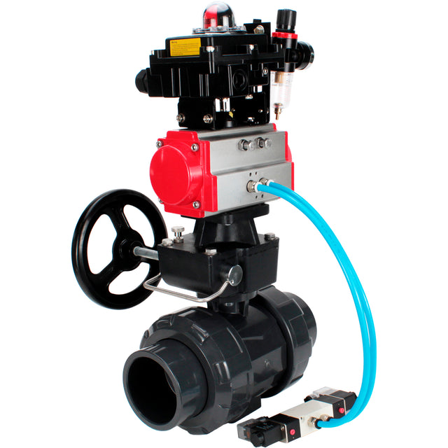 Ball valves Elephant BV4242E-FP-GRM-ISO, body material - UPVC, ball material - UPVC, seal - EPDM, with pneumatic actuator double action PA-DA, pneumatic distributor 4V320-08 220V, LSU APL-410N EX, ATU AFC2000 and handwheel MON