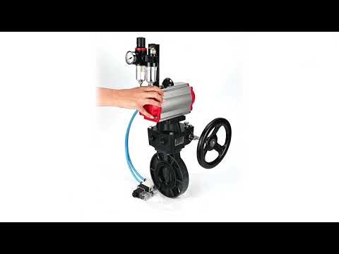 Butterfly valves Elephant WBV4242E-2W-Fb-ISO, body material - UPVC, disc material - UPVC, seal - EPDM, with pneumatic actuator double action PA-DA, pneumatic distributor 4V320-08 220V, ATU AFC2000 and handwheel MON