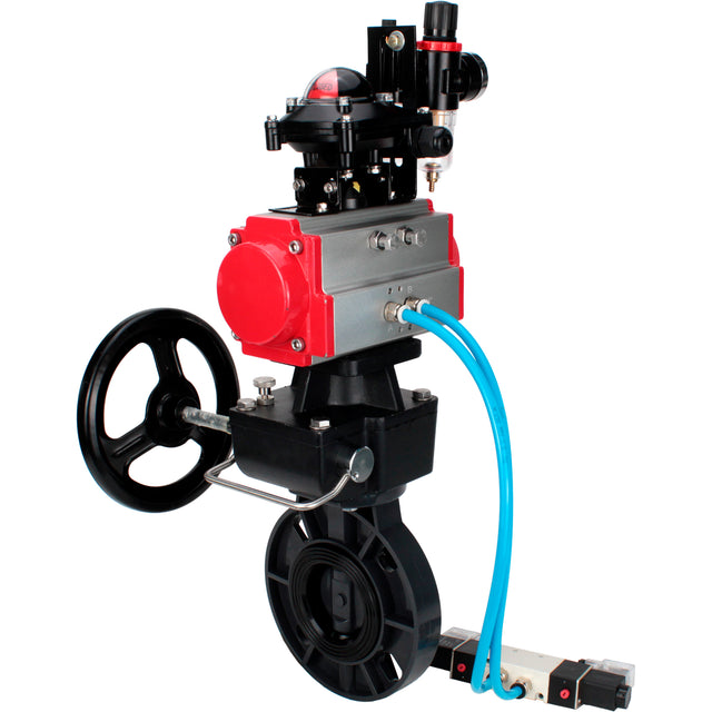 Butterfly valves Elephant WBV4242E-2W-Fb-ISO, body material - UPVC, disc material - UPVC, seal - EPDM, with pneumatic actuator double action PA-DA, pneumatic distributor 4V320-10 220V, LSU APL-210N, ATU AFC2000 and handwheel MON