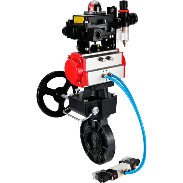 Butterfly valves Elephant WBV4242E-2W-Fb-ISO, body material - UPVC, disc material - UPVC, seal - EPDM, with pneumatic actuator double action PA-DA, pneumatic distributor 4V320-10 220V, LSU APL-410N EX, ATU AFC2000 and handwheel MON