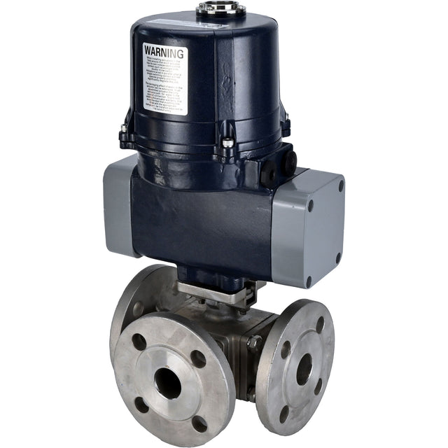 Ball valves Elephant BV3232P(4pc)-FP-3WL-F-ISO-H full bore, three-way, flanged, body - SS316 stainless steel, seal - PTFE, with electric quarter turn actuator Elephant QTSA-N-EM-O0-220VAC