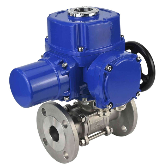 Válvula de bola de acero inoxidable Elephant BVFPT.304.180 de tres piezas, material del cuerpo - acero inoxidable SS304, sello - PTFE, brida, paso completo, actuador eléctrico de cuarto de vuelta Elephant QT-W (M) 380 V