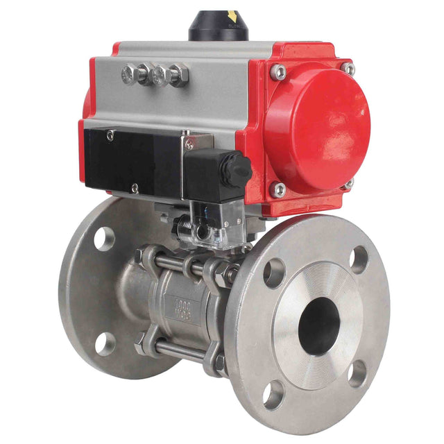 Válvula de bola de acero inoxidable Elephant ksfpt-316-180-sa-4m310-110/220v, material del cuerpo - acero inoxidable AISI 316, material de la bola - acero inoxidable AISI 316, sello - PTFE, actuador neumático operado